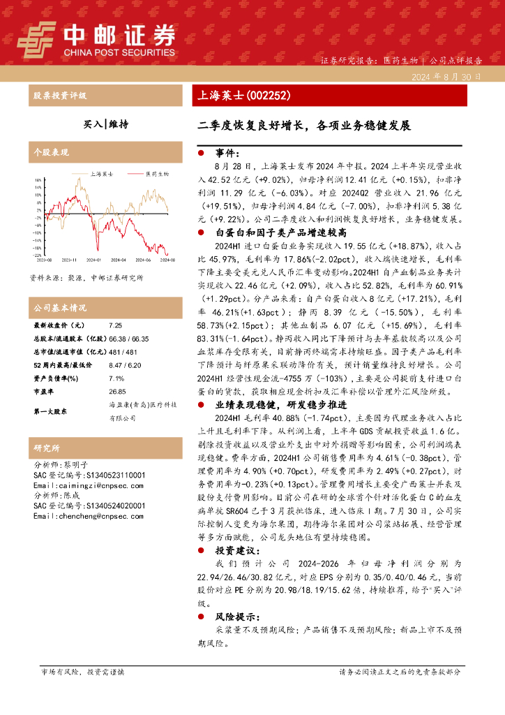 中邮证券:上海莱士(002252)-二季度恢复良好增长,各项业务稳健发展.pdf