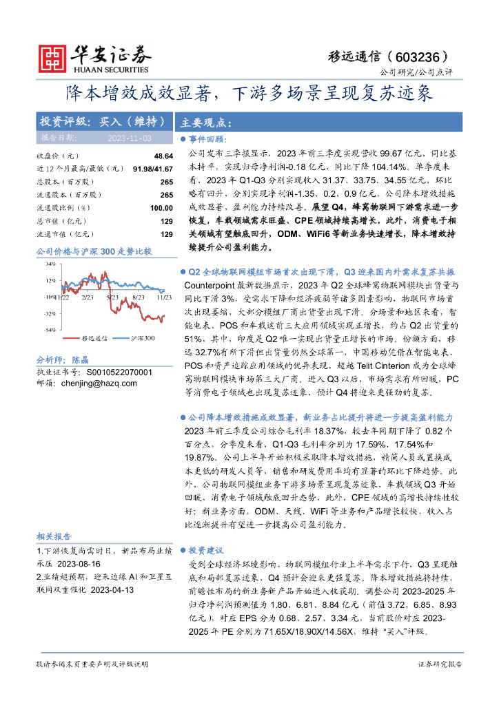 华安证券:移远通信(603236)-降本增效成效显著,下游多场景呈现复苏迹象.pdf