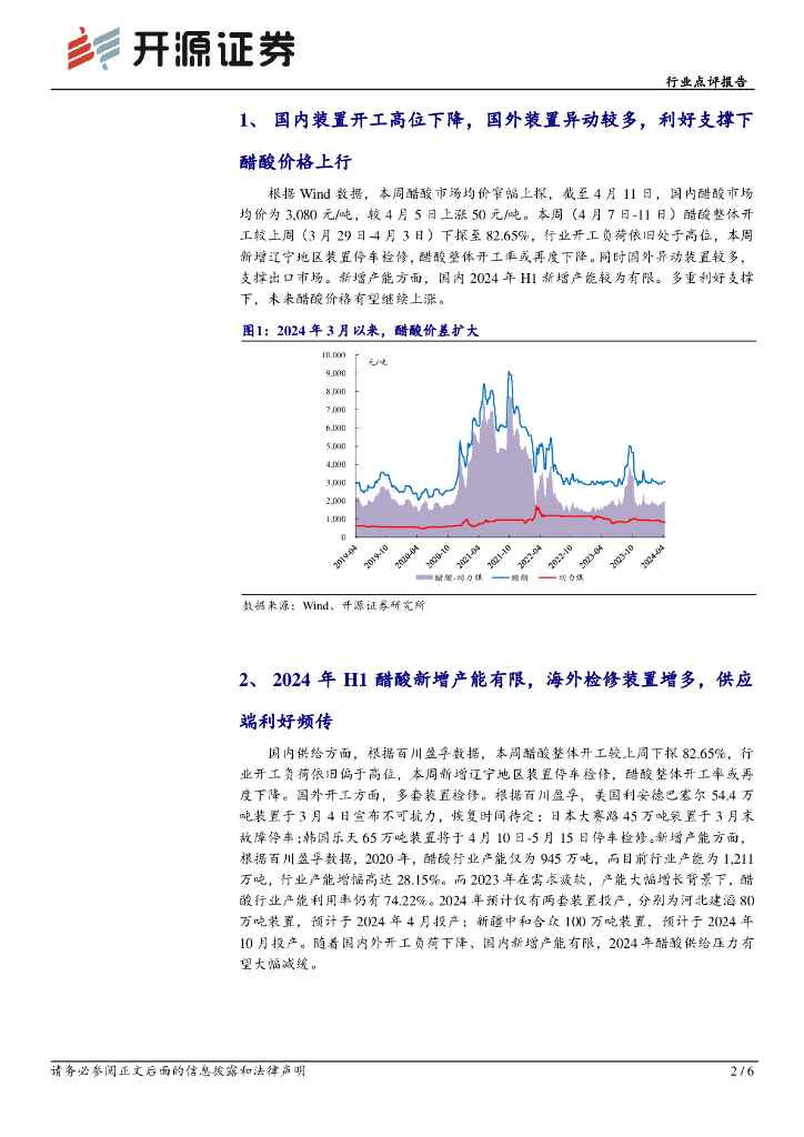 开源证券:基础化工行业点评报告:国内外装置异动较多,2024年H1新增产能有限,醋酸价格或继续上行.pdf
