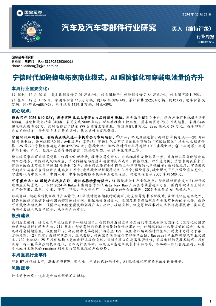 国金证券:汽车及汽车零部件行业周报:宁德时代加码换电拓宽商业模式,AI眼镜催化可穿戴电池量价齐升.pdf