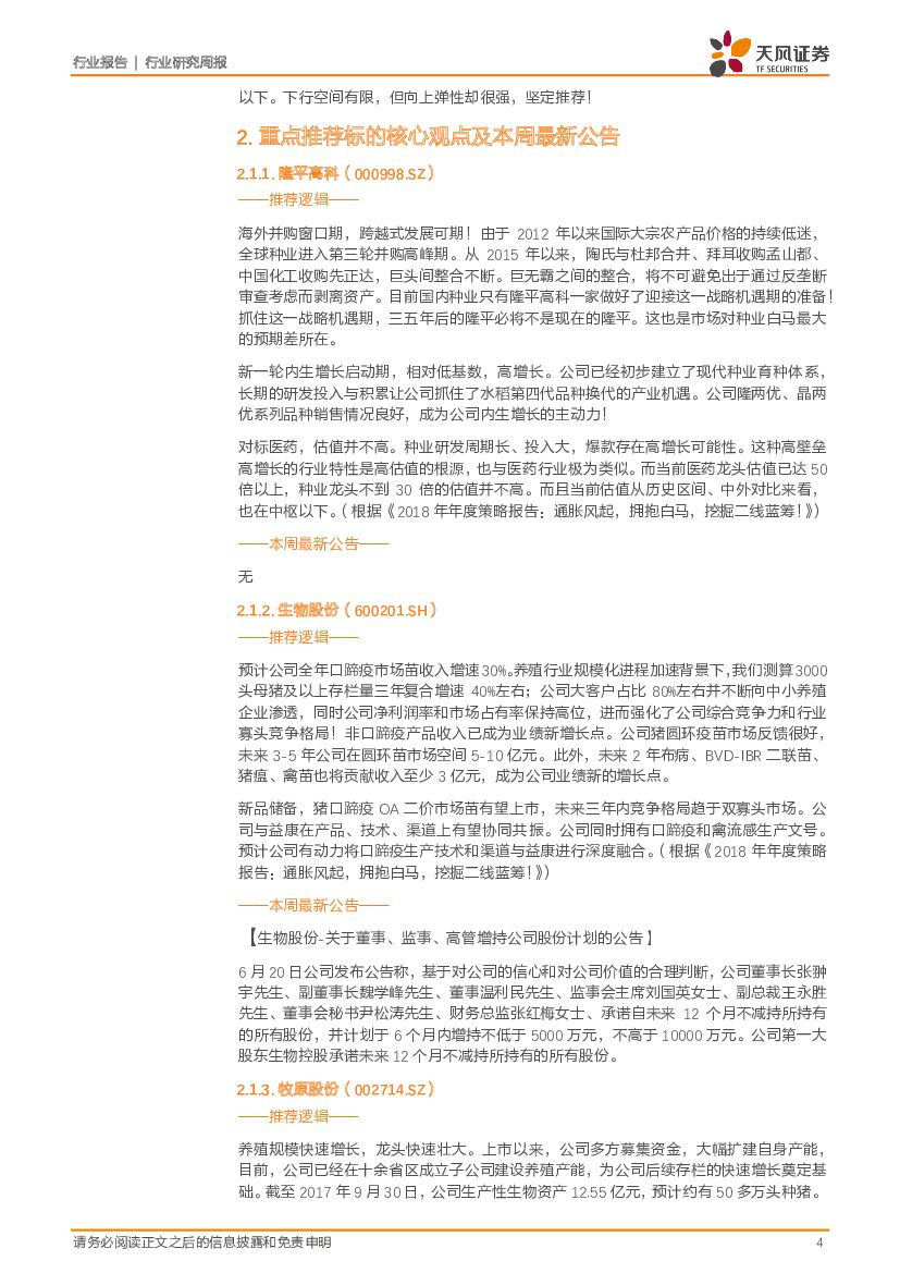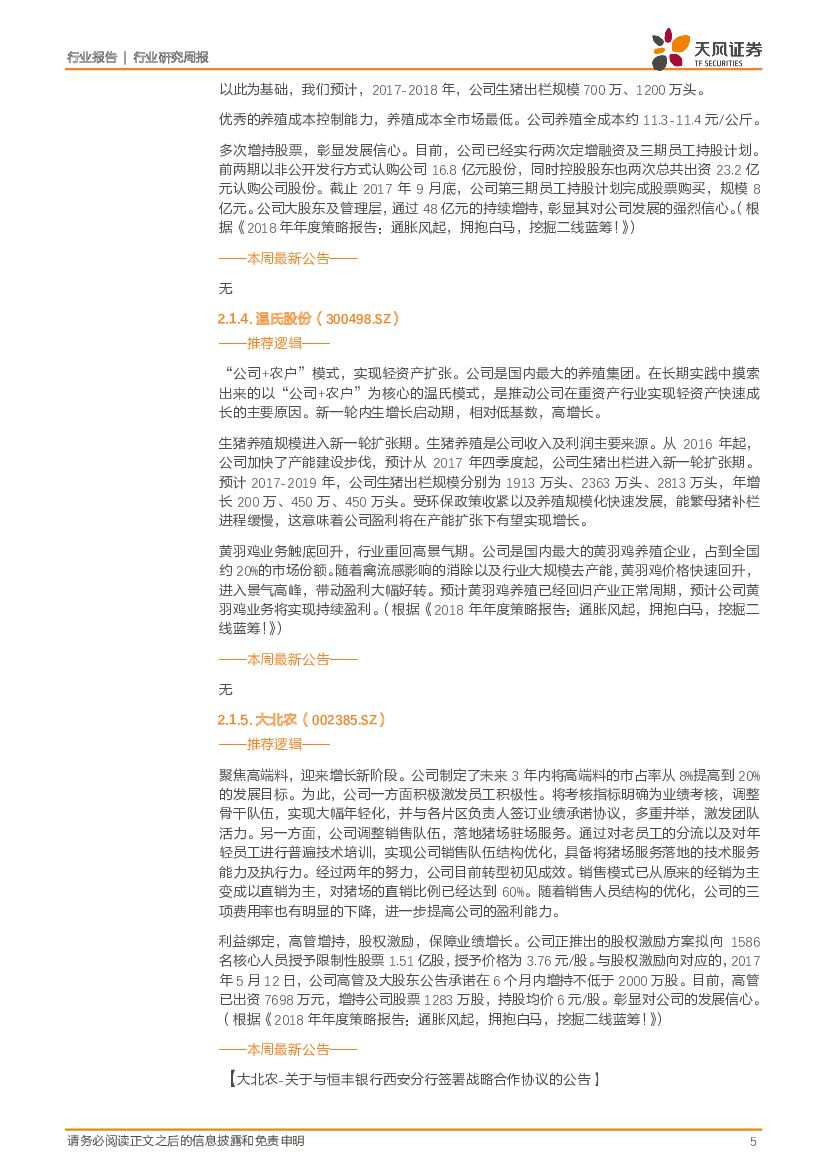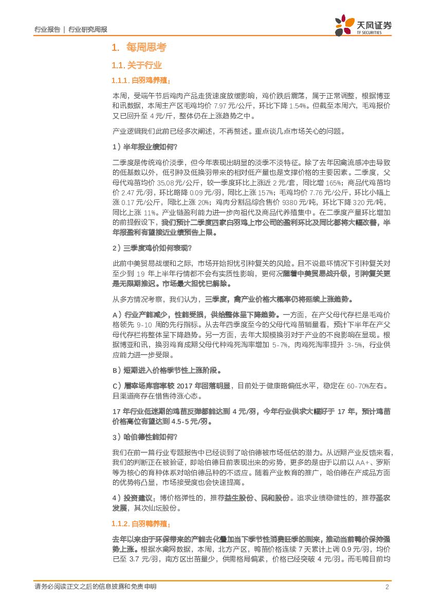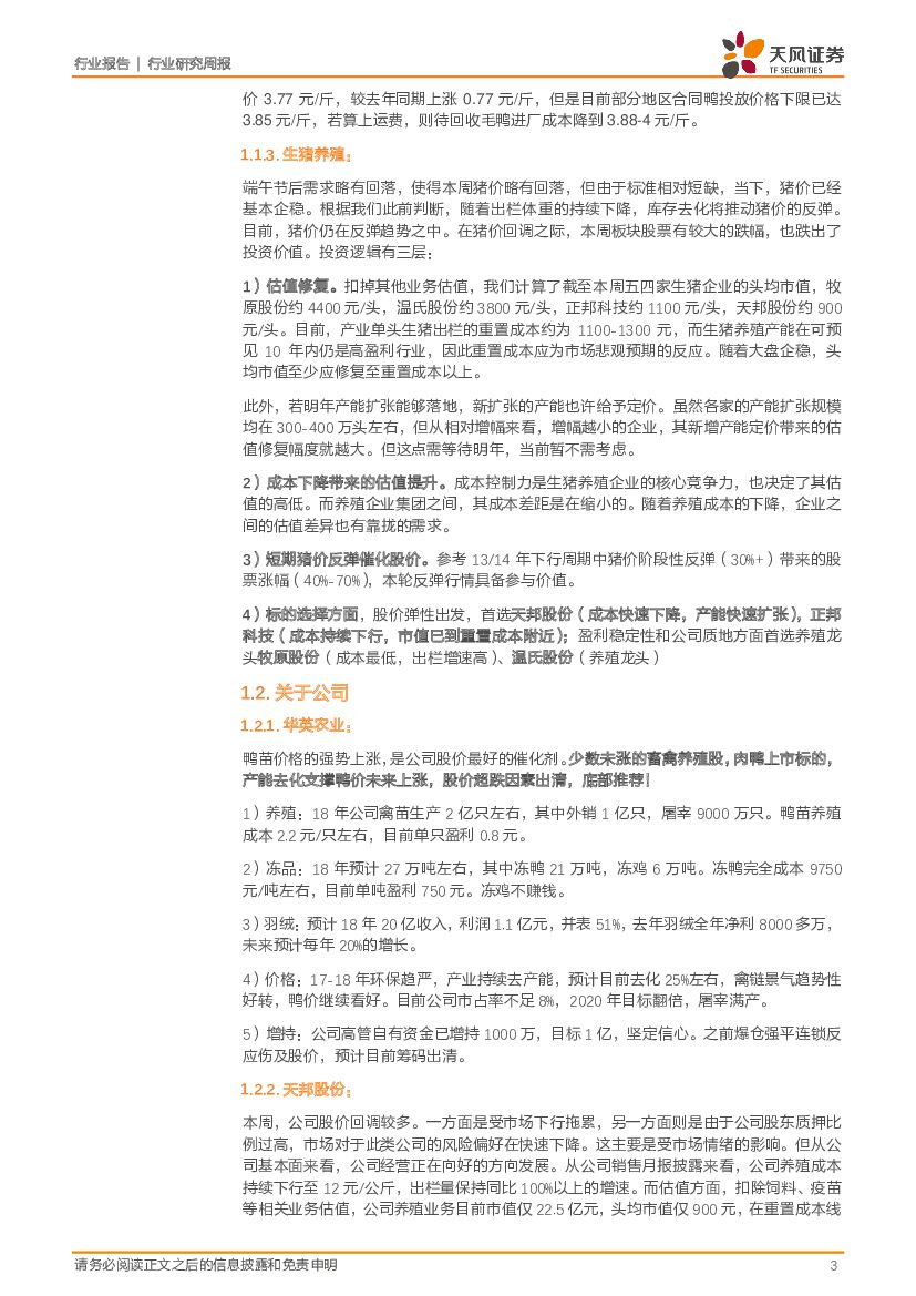 天风证券:农林牧渔2018年第25周周报:中报期将至,挖掘超预期标的!本周继续重点推荐二季度畜禽板块投资机会!(鸡价上涨+引种受限、鸭龙头底部+国企改革、猪价反弹+股价回调).pdf