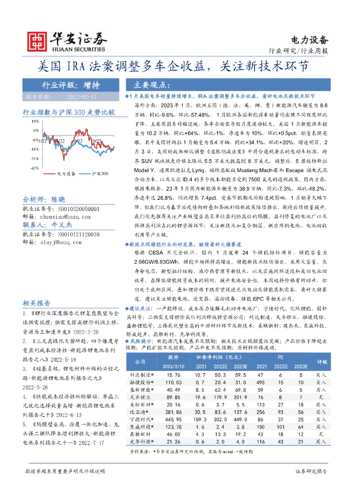 华安证券:电力设备行业周报:美国IRA法案调整多车企收益,关注新技术环节.pdf