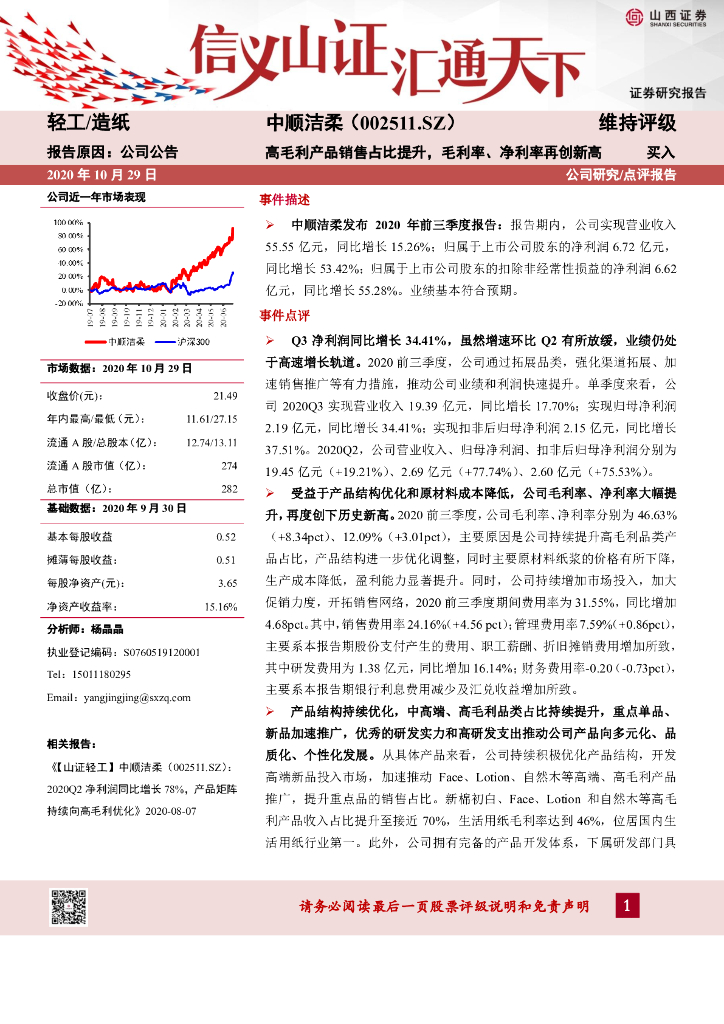山西证券:中顺洁柔(002511)-高毛利产品销售占比提升,毛利率、净利率再创新高.pdf