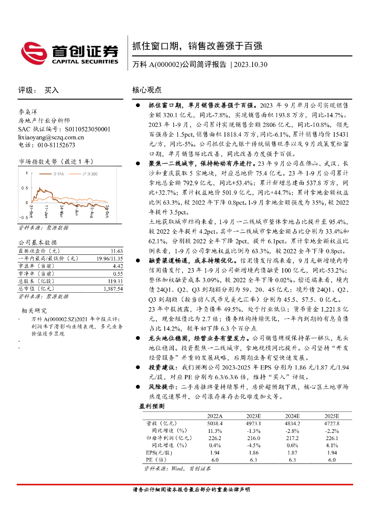 首创证券:万科A(000002)-公司简评报告:抓住窗口期,销售改善强于百强.pdf