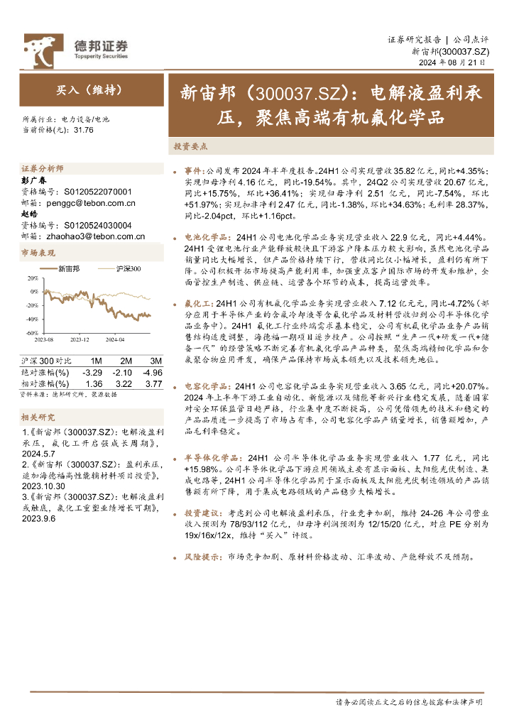德邦证券:新宙邦(300037)-电解液盈利承压,聚焦高端有机氟化学品.pdf