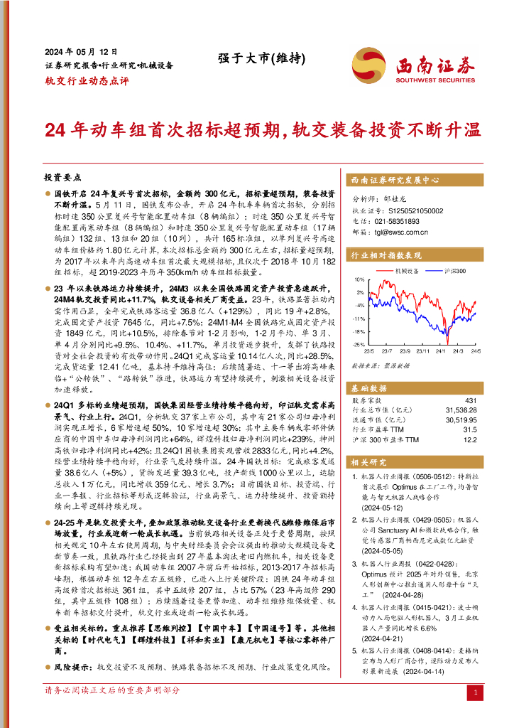 西南证券:轨交行业动态点评:24年动车组首次招标超预期,轨交装备投资不断升温.pdf