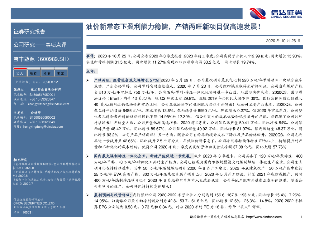 信达证券:宝丰能源(600989)-油价新常态下盈利能力稳健,产销两旺新项目促高速发展!.pdf