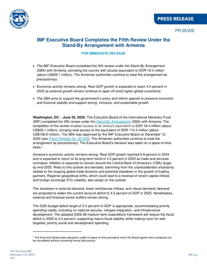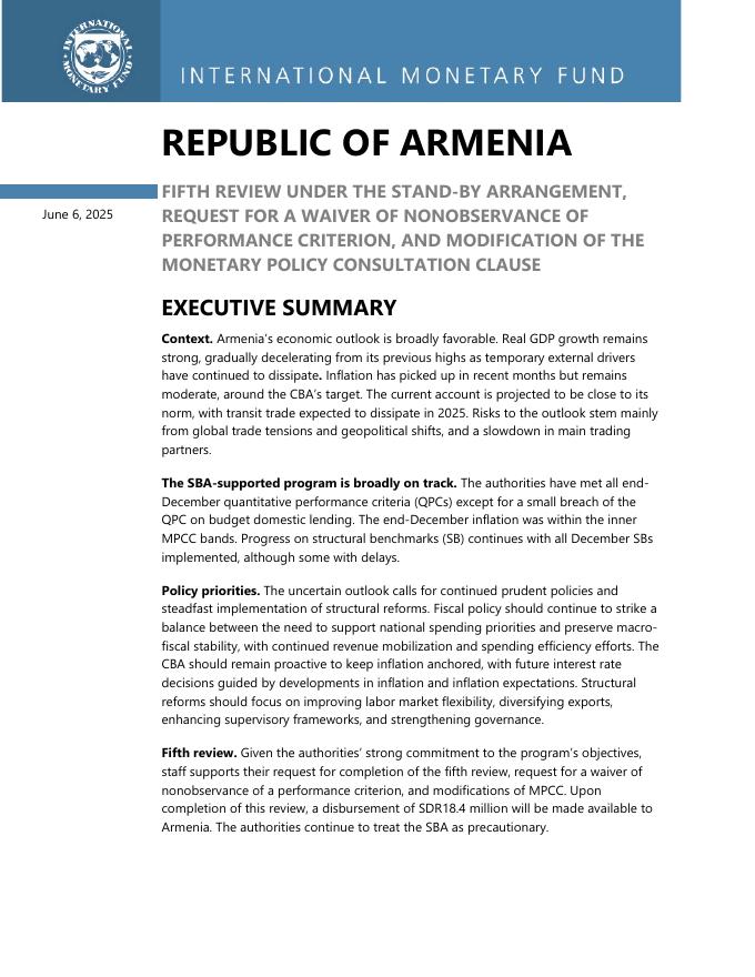 国际货币基金组织:2025年亚美尼亚共和国:第五次备用安排审查、绩效标准未遵守豁免请求以及货币政策咨询条款修改-新闻稿和工作人员报告(英文版).pdf