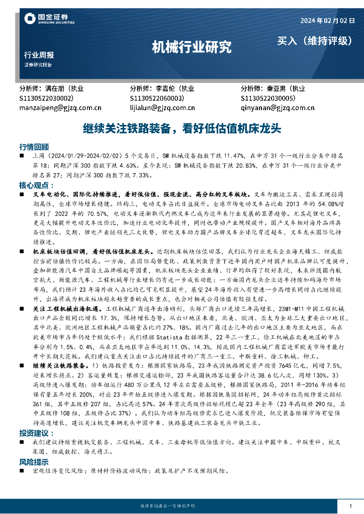 国金证券:机械行业周报:继续关注铁路装备,看好低估值机床龙头.pdf