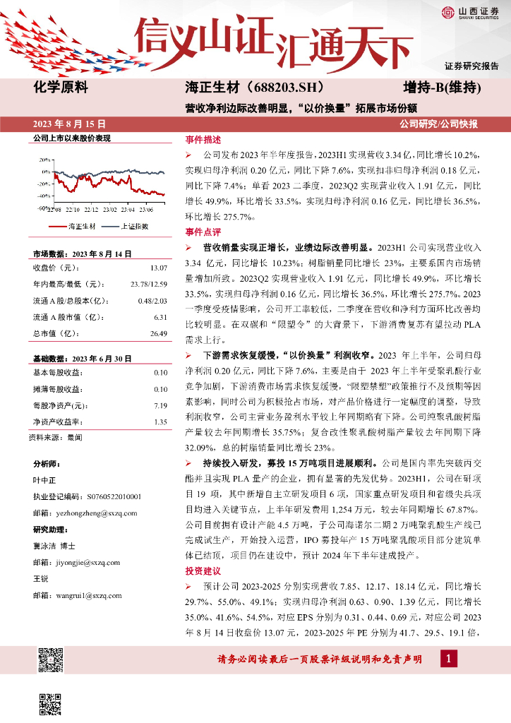 山西证券:海正生材(688203)-营收净利边际改善明显,“以价换量”拓展市场份额.pdf