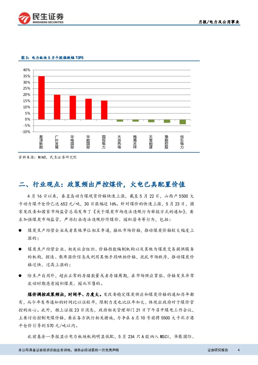 民生证券:电力及公用事业月报:政策频出严控煤价,关注火电投资机会.pdf