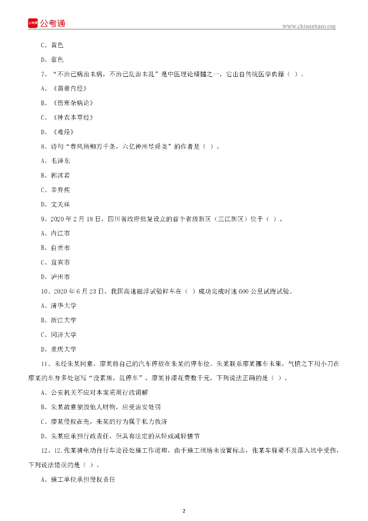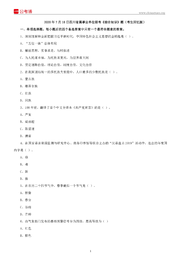 2020年7月18日四川省属事业单位联考《综合知识》题(考生回忆版).pdf