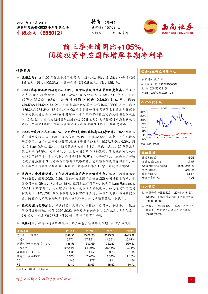 西南证券:中微公司(688012)-前三季业绩同比+105%,间接投资中芯国际增厚本期净利率.pdf