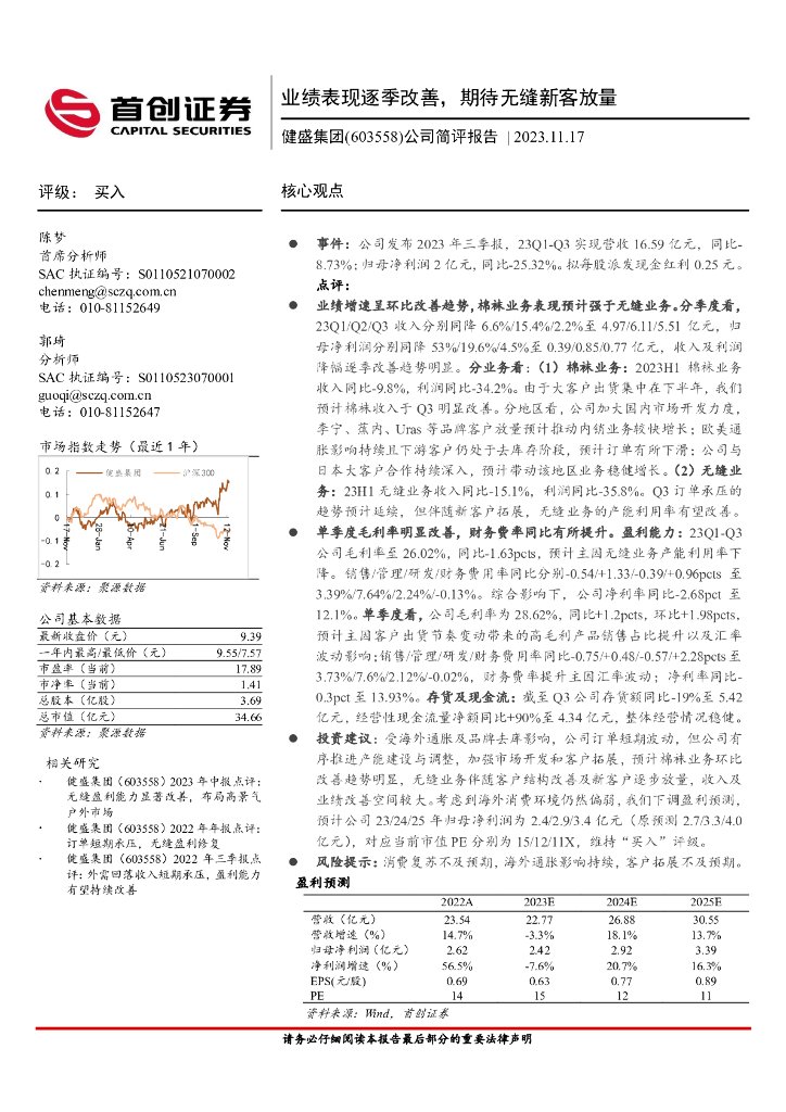 首创证券:健盛集团(603558)-公司简评报告:业绩表现逐季改善,期待无缝新客放量.pdf
