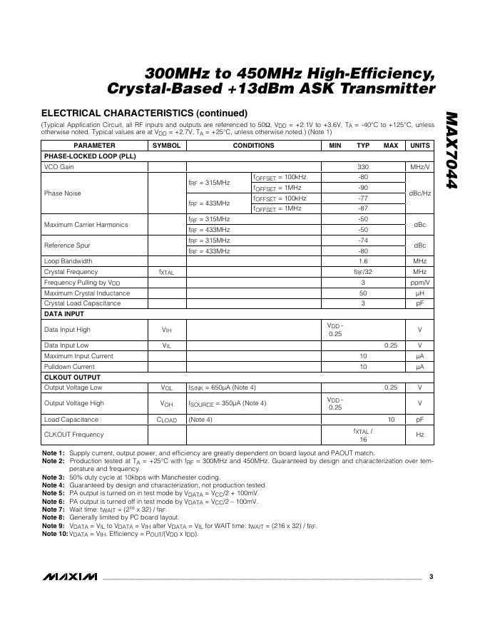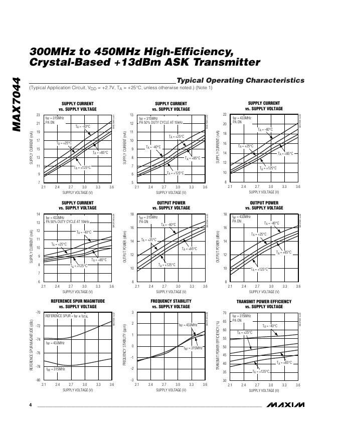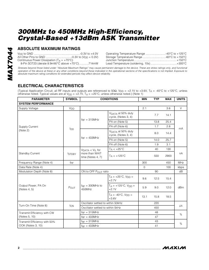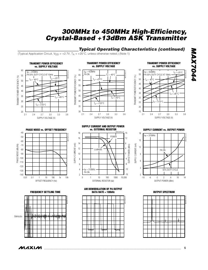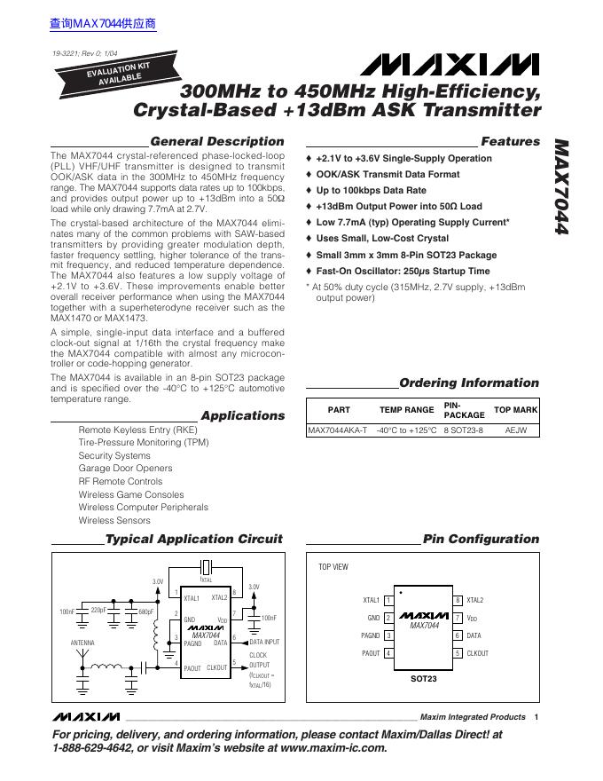 MAXIM 300MHz to 450MHz High-Efficiency, Crystal-Based +13dBm ASK Transmitter MAX7044 数据手册.pdf