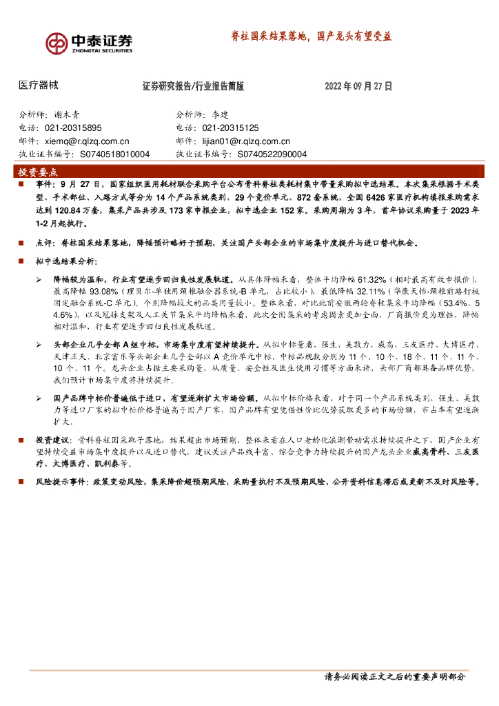 中泰证券:医疗器械行业:脊柱国采结果落地,国产龙头有望受益.pdf