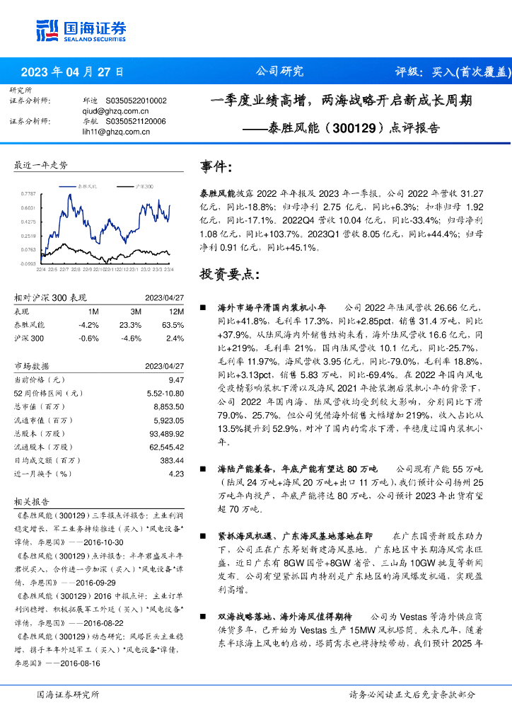 国海证券:泰胜风能(300129)-点评报告:一季度业绩高增,两海战略开启新成长周期.pdf