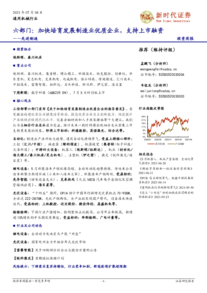 新时代证券:先进制造投资周报:六部门:加快培育发展制造业优质企业,支持上市融资.pdf