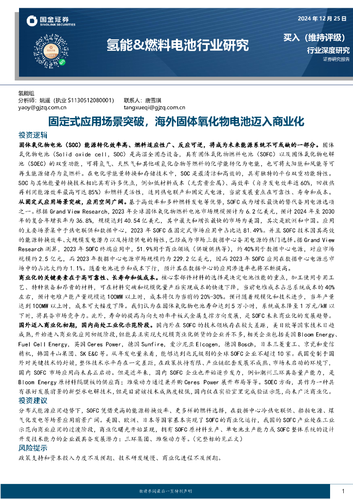 国金证券:氢能&燃料电池行业研究:固定式应用场景突破,海外固体氧化物电池迈入商业化.pdf