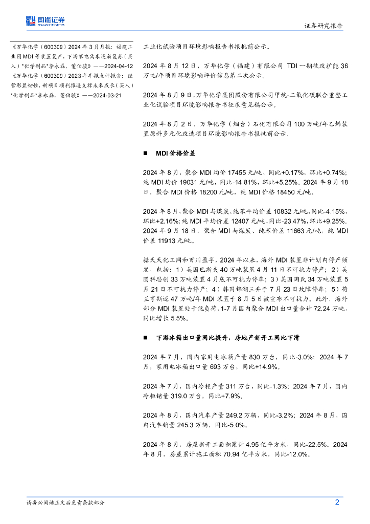国海证券:万华化学(600309)-2024年8月月报:聚合MDI价格上涨,烟台MDI和TDI装置复产.pdf