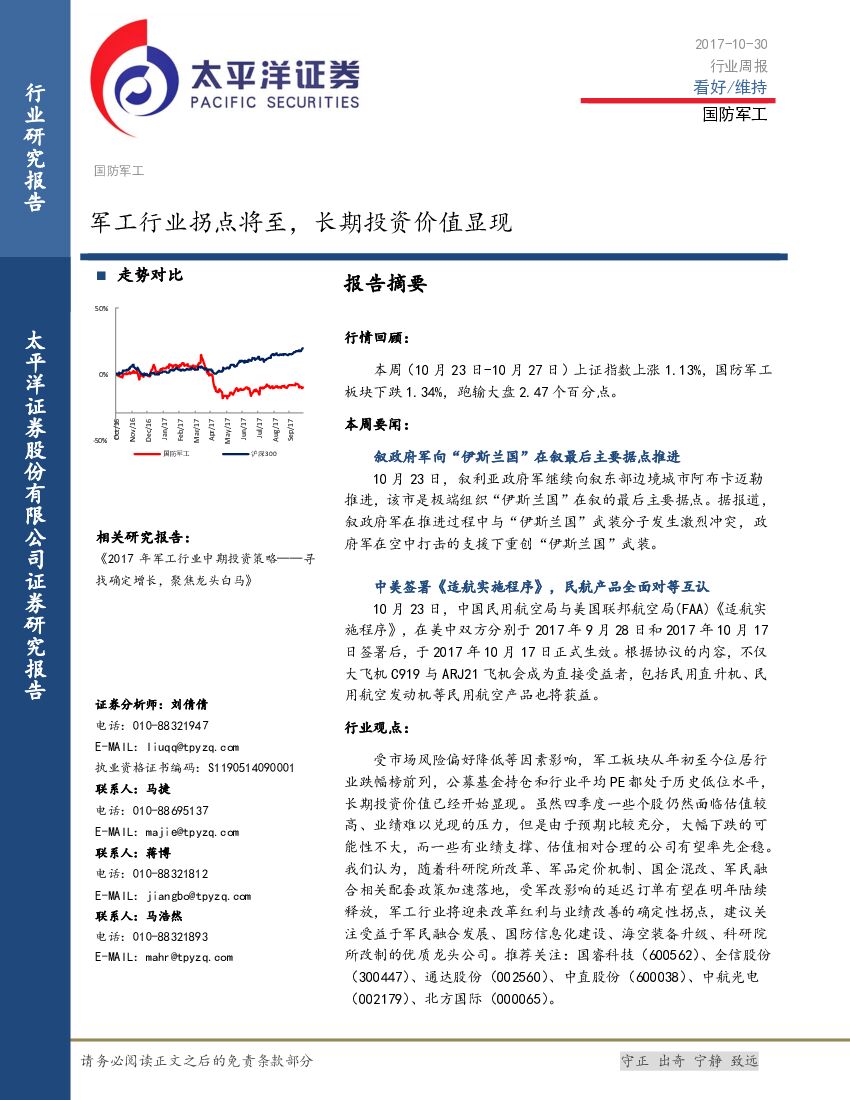 太平洋证券:国防军工行业周报:军工行业拐点将至,长期投资价值显现.pdf