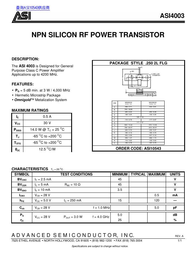 ASI ASI4003 NPN SILICON RF POWER TRANSISTOR 数据手册.pdf