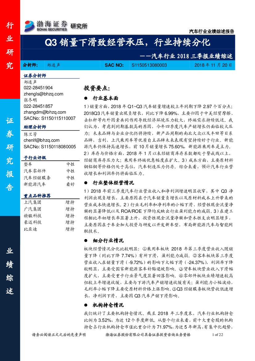渤海证券:汽车行业2018三季报业绩综述:Q3销量下滑致经营承压,行业持续分化.pdf