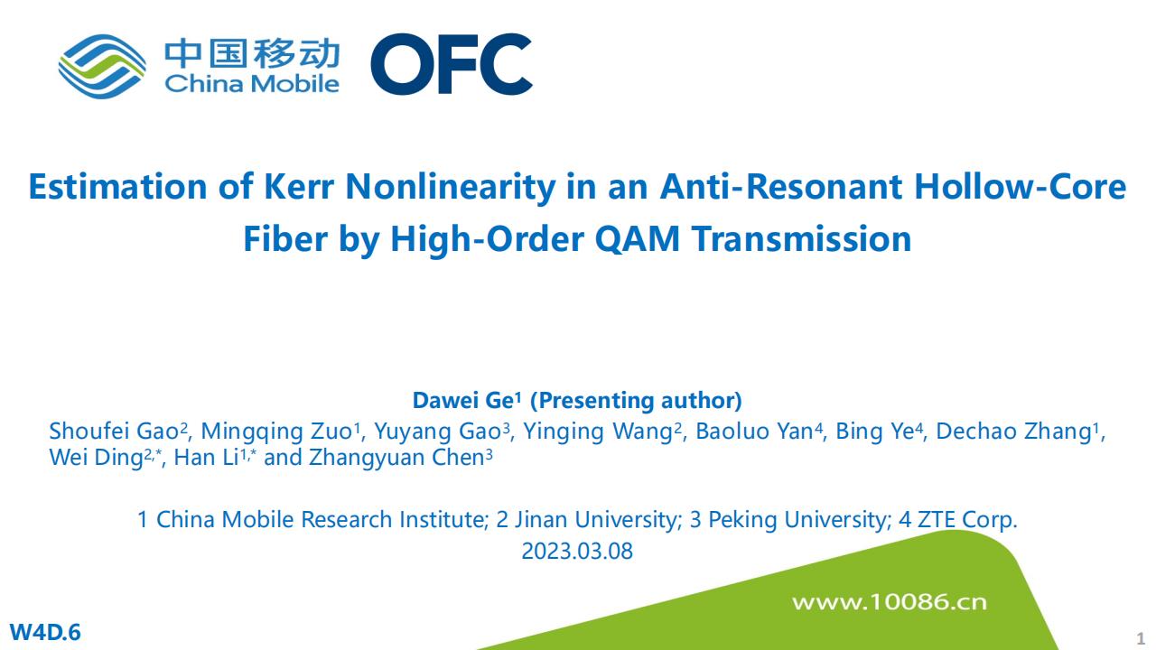 中国移动研究院葛大伟:基于连体管空芯光纤的超大功率40×800G DP-64QAM-PCS 无非线性损伤实时传输(英文版).pdf