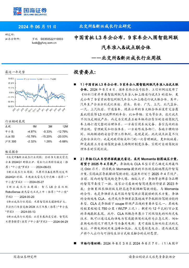 国海证券:北交所&新兴成长行业周报:中国首批L3车企公布,9家车企入围智能网联汽车准入&试点联合体.pdf