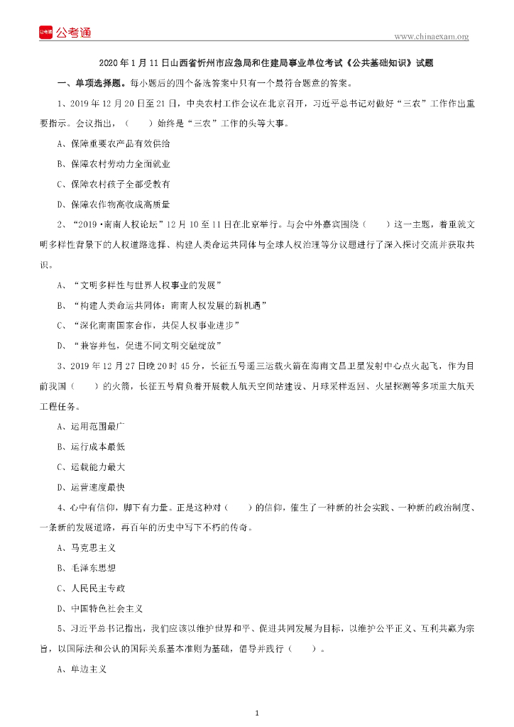 2020年1月11日山西省忻州市应急局和住建局事业单位考试《公共基础知识》试题 ...pdf