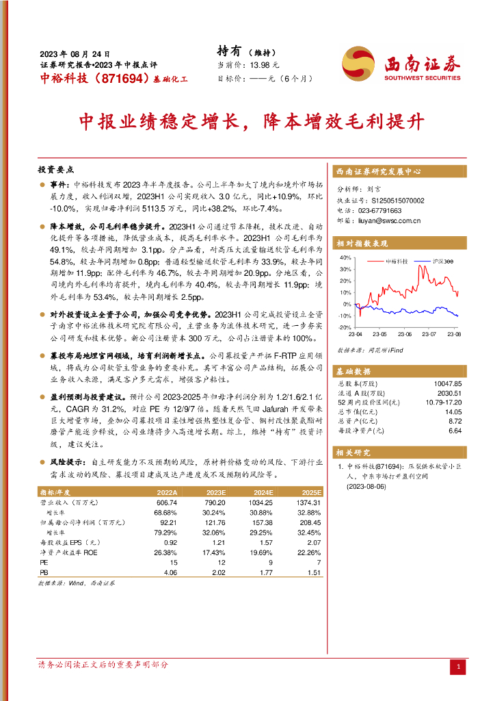 西南证券:中裕科技(871694)-中报业绩稳定增长,降本增效毛利提升.pdf