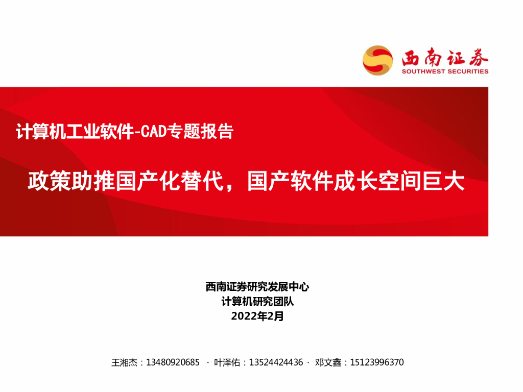 西南证券:计算机工业软件-CAD专题报告:政策助推国产化替代,国产软件成长空间巨大.pdf