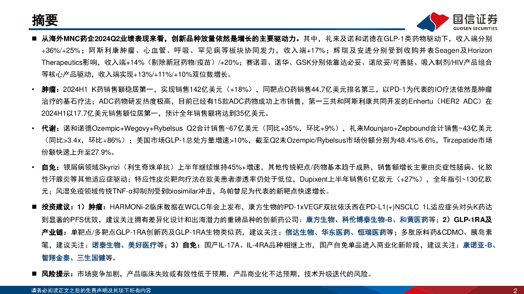 国信证券:海外药企2024Q2业绩回顾:关注国内创新出海及国产品种商业化.pdf