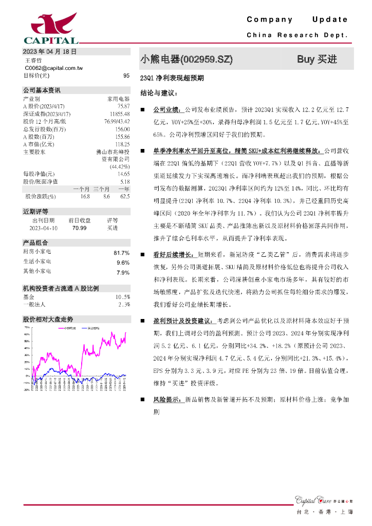 群益证券:小熊电器(002959)-23Q1净利表现超预期.pdf