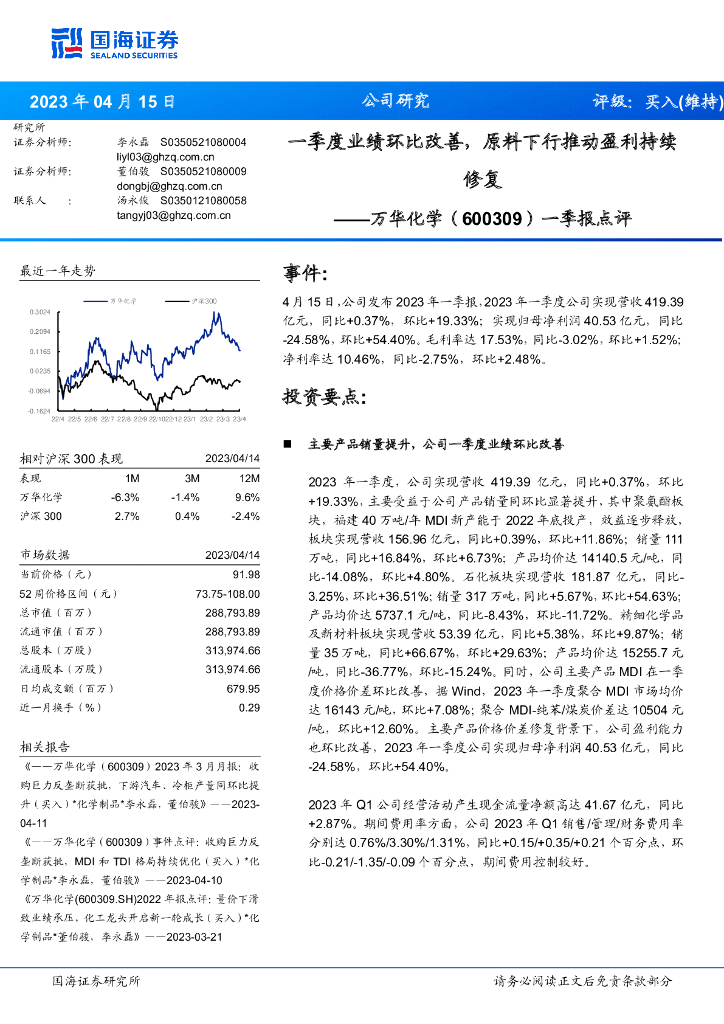 国海证券:万华化学(600309)-一季报点评:一季度业绩环比改善,原料下行推动盈利持续修复.pdf
