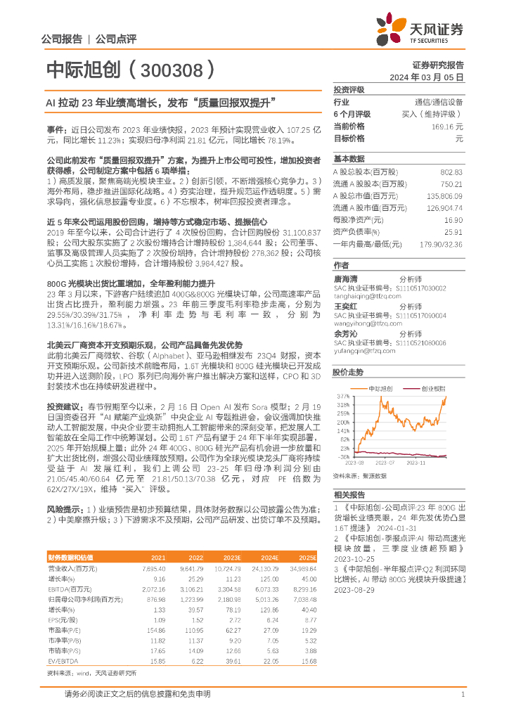 天风证券:中际旭创(300308)-AI拉动23年业绩高增长,发布“质量回报双提升”.pdf