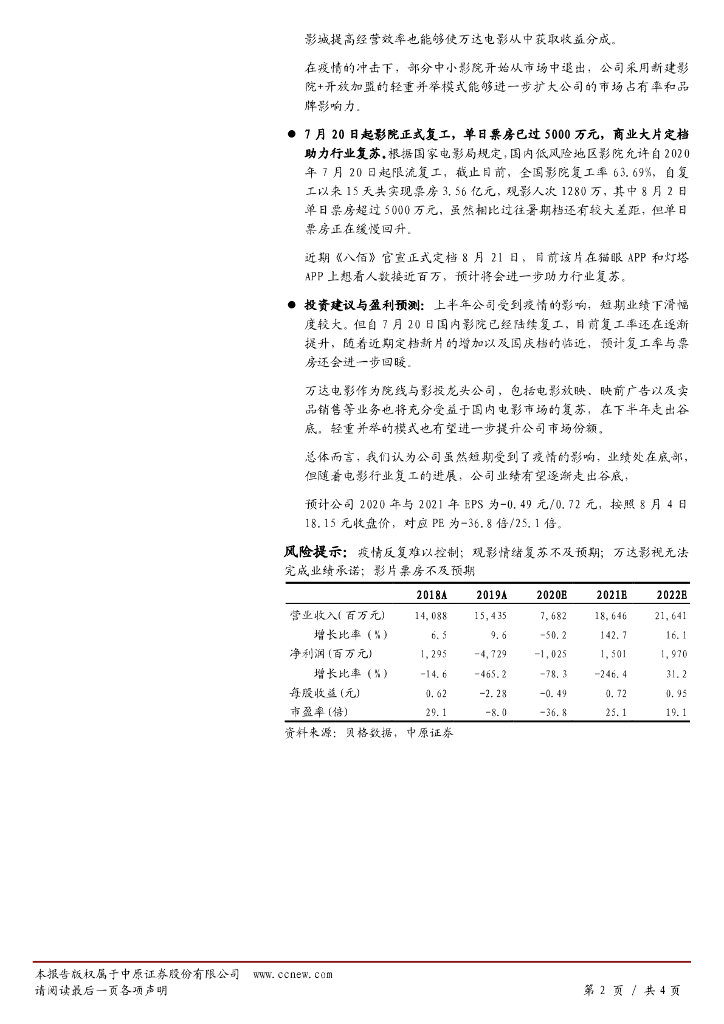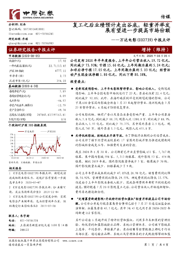 中原证券:万达电影(002739)-中报点评:复工之后业绩预计走出谷底,轻重并举发展有望进一步提高市场份额.pdf