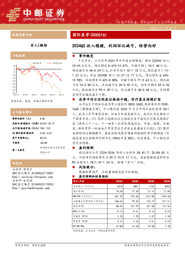 中邮证券:国际医学(000516)-2024Q2收入稳健,利润环比减亏,经营向好.pdf