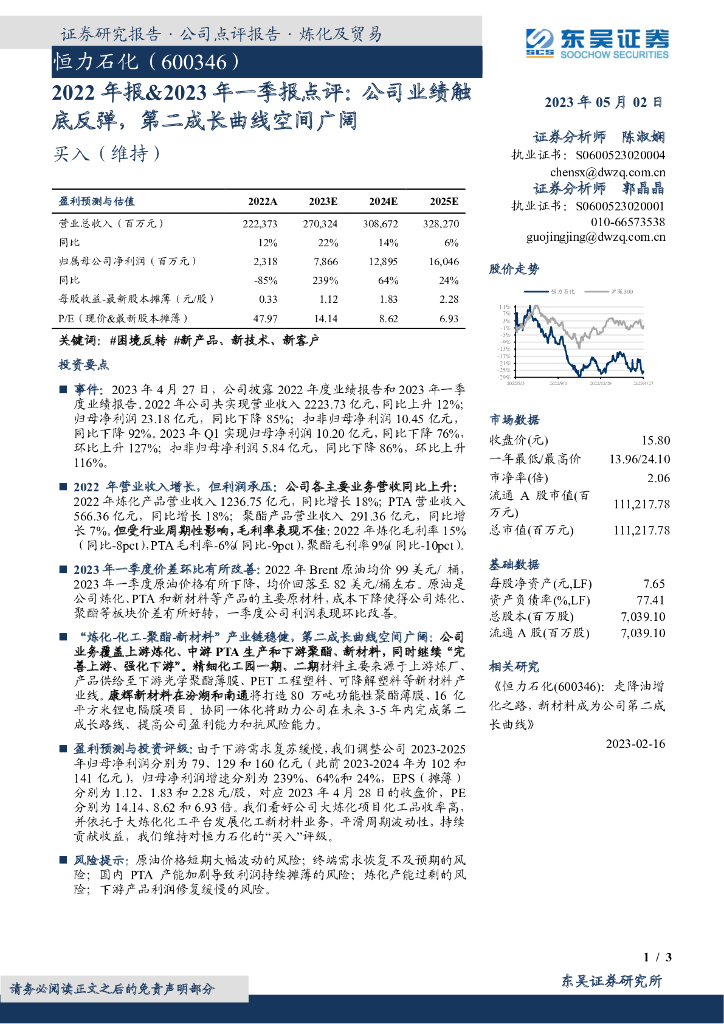 东吴证券:恒力石化(600346)-2022年报&2023年一季报点评:公司业绩触底反弹,第二成长曲线空间广阔.pdf