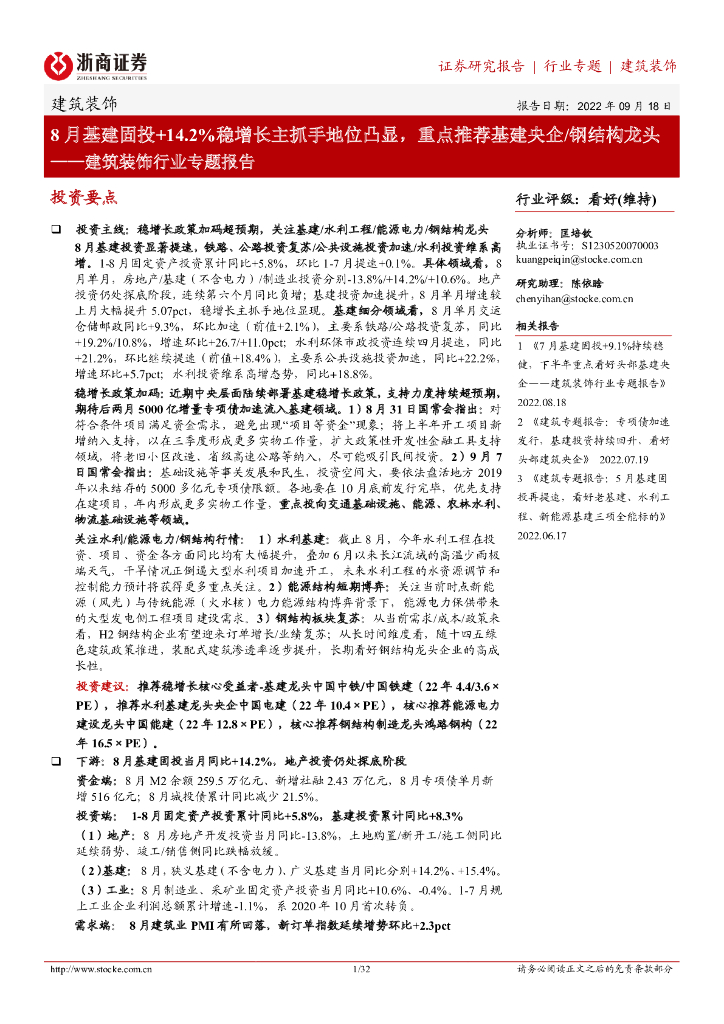 浙商证券:建筑装饰行业专题报告:8月基建固投+14.2%稳增长主抓手地位凸显,重点推荐基建央企/钢结构龙头.pdf