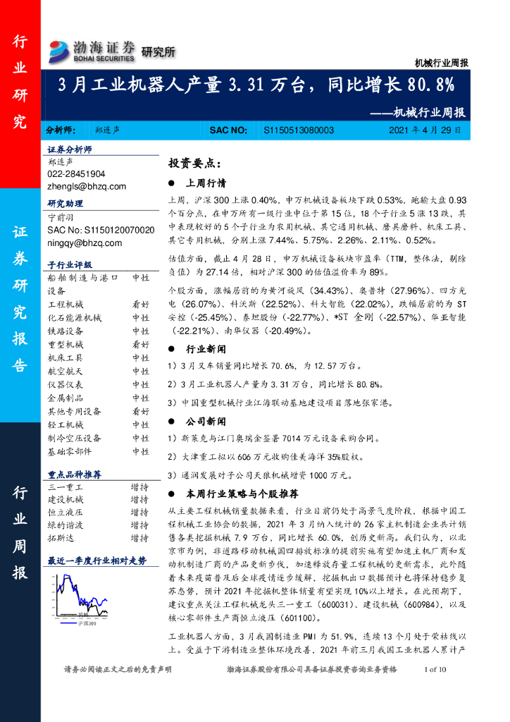 渤海证券:机械行业周报:3月工业机器人产量3.31万台,同比增长80.8%.pdf