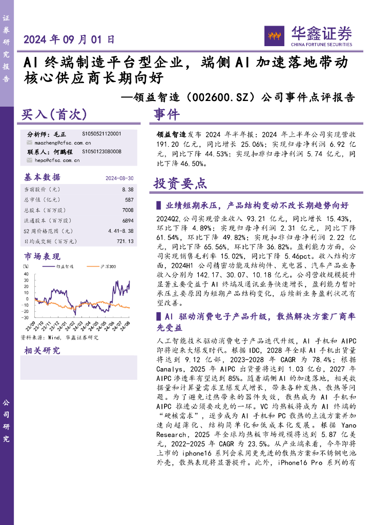 华鑫证券:领益智造(002600)-公司事件点评报告:AI终端制造平台型企业,端侧AI加速落地带动核心供应商长期向好.pdf