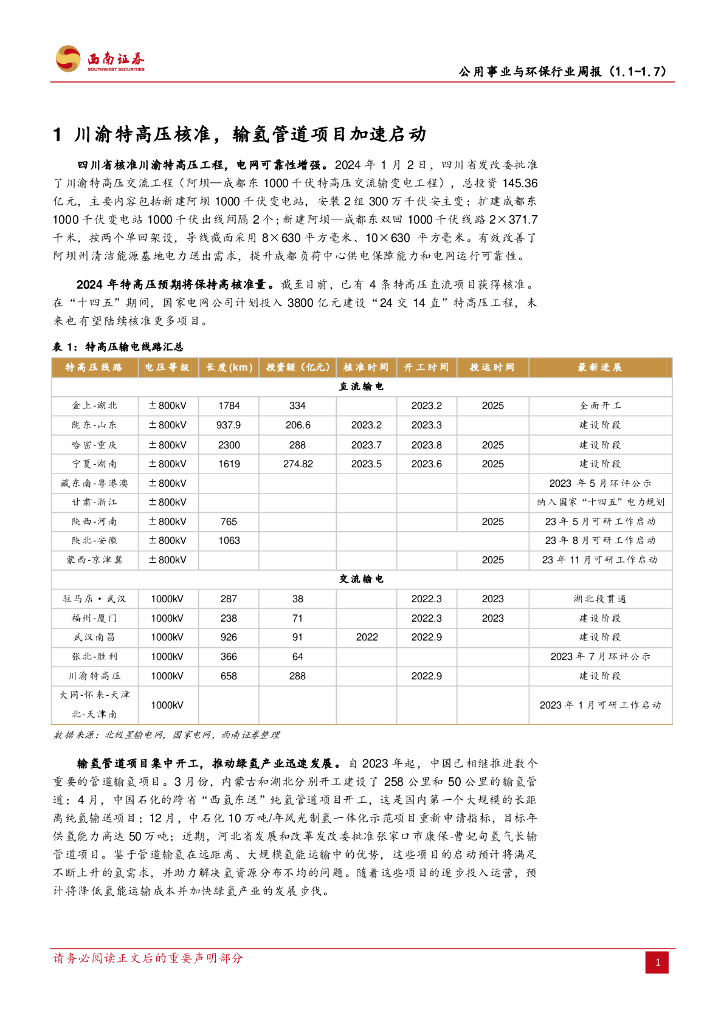 西南证券:公用事业与环保行业周报:川渝特高压核准,输氢管道项目加速启动.pdf