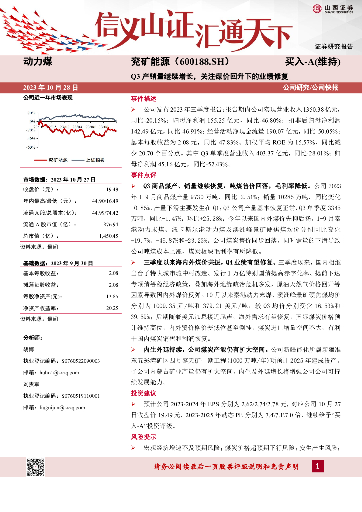 山西证券:兖矿能源(600188)-Q3产销量继续增长,关注煤价回升下的业绩修复.pdf