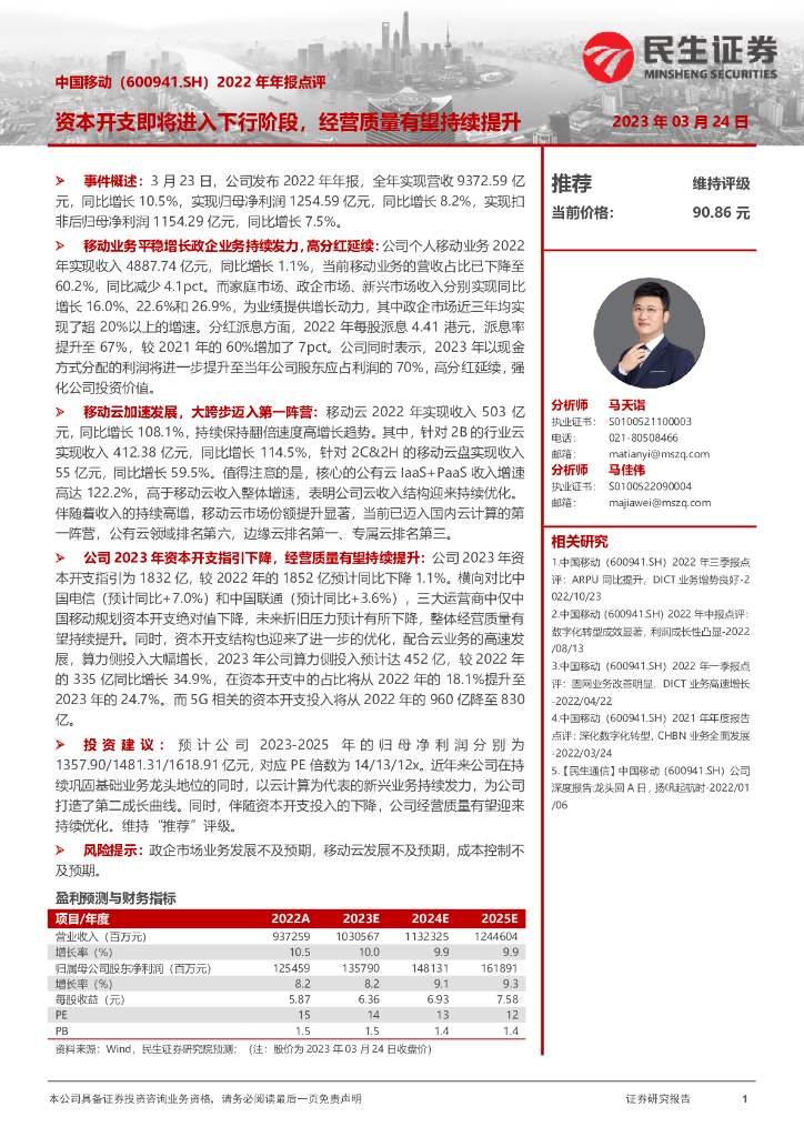 民生证券:中国移动(600941)-2022年年报点评:资本开支即将进入下行阶段,经营质量有望持续提升.pdf
