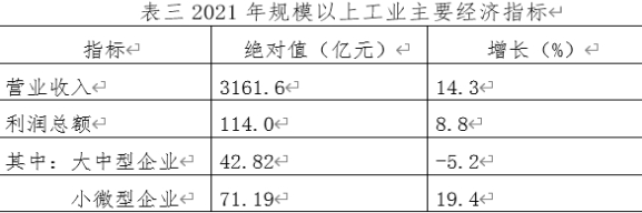 全年规模以上工业实现营业收入3161.6亿元,比上年增长14.3%;实现利润114.0亿元,增长8.8%,其中:九大主要行业实现利润103.6亿元,占全部规模以上工业的90.9%。