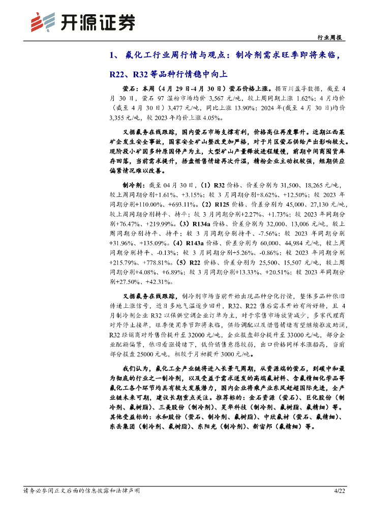 开源证券:化学原料行业周报:制冷剂需求旺季即将来临,R22、R32等品种行情稳中向上.pdf