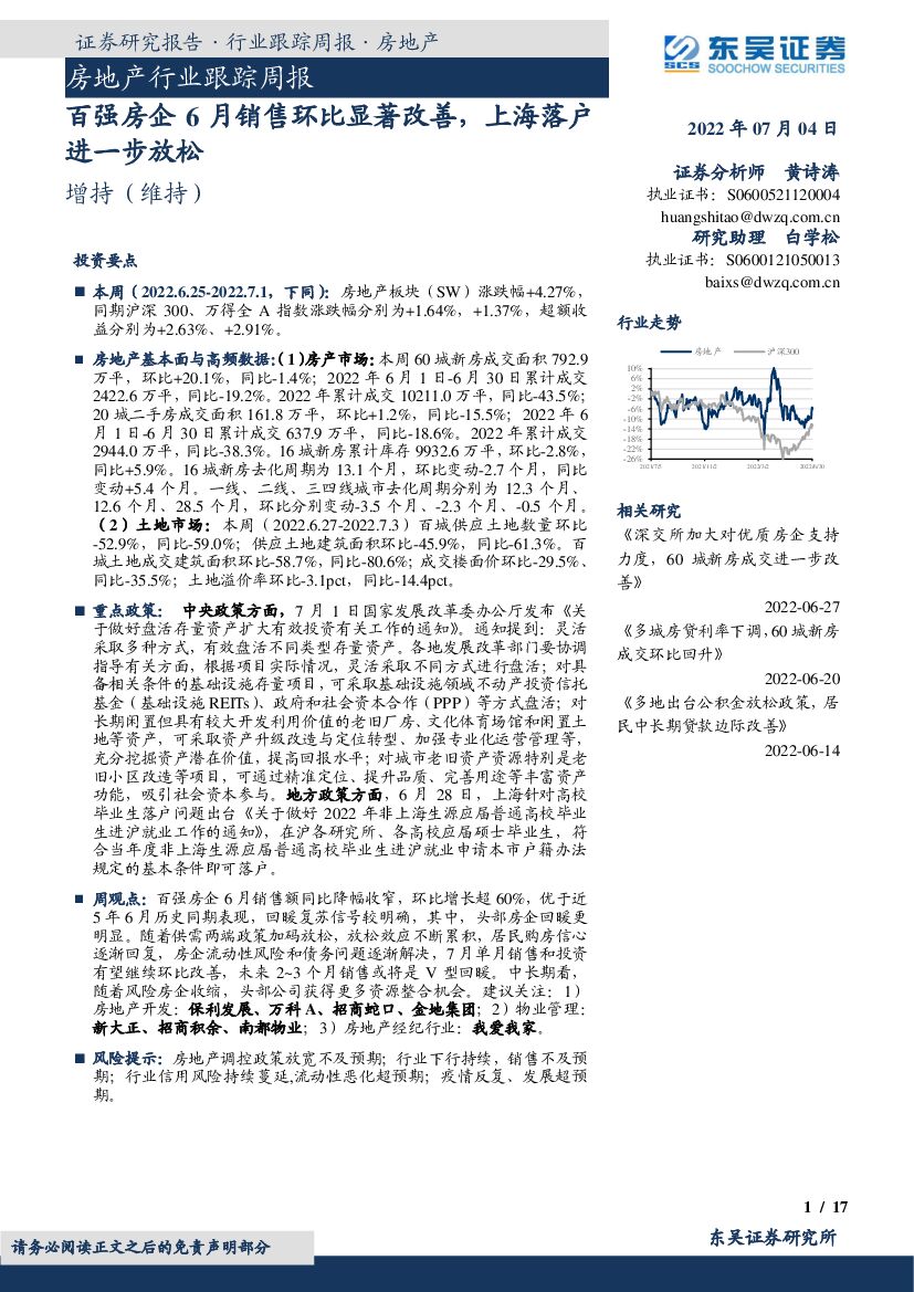 东吴证券:房地产行业跟踪周报:百强房企6月销售环比显著改善,上海落户进一步放松.pdf