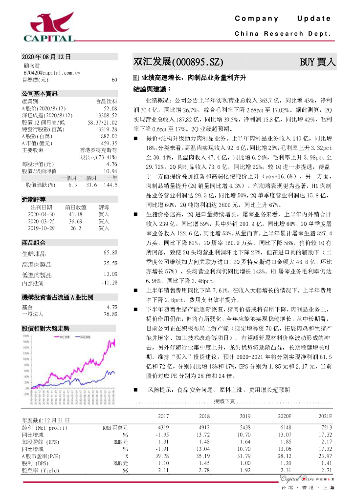 群益证券:双汇发展(000895)-H1业绩高速增长,肉制品业务量利齐升.pdf