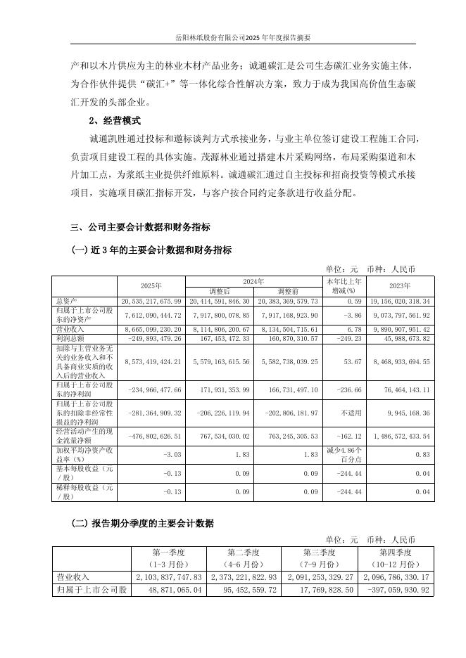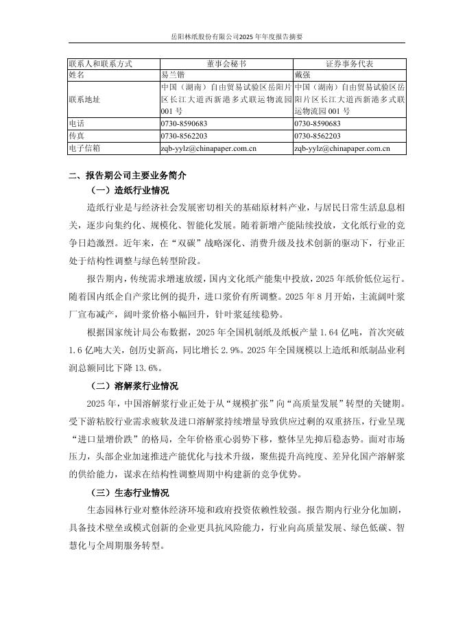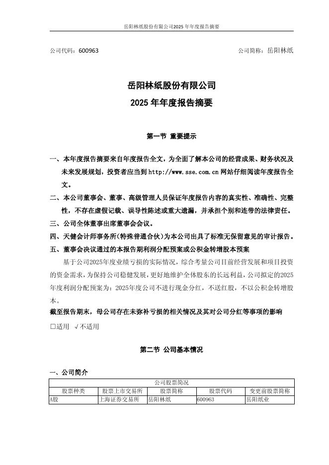 600963-岳阳林纸:岳阳林纸股份有限公司2025年年度报告摘要.pdf